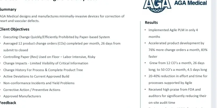 AGA Medical, a pioneer in designing and manufacturing minimally-invasive devices for heart and vascular defect corrections, faced challenges with a paper-based system that hindered efficient change execution. By implementing Agile PLM, they not only accelerated product development but also achieved a remarkable 83% speed increase in closing product change orders. This transformation led to a significant reduction in effort and time for processes supported by Agile. Moreover, their successful transition from paper to electronic systems garnered high praise from FDA and auditors. Dive into this case study to discover how AGA Medical revolutionized their operations in a short span.