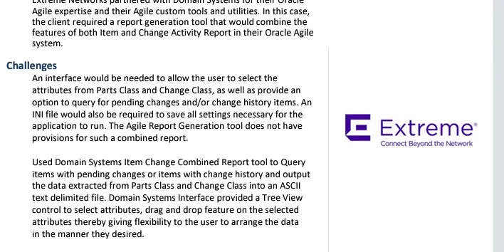 Extreme Networks, a leader in delivering software-driven networking solutions, collaborated with Domain Systems to leverage their Oracle Agile expertise. The challenge was to develop a report generation tool that combined the features of both Item and Change Activity Report in the Oracle Agile system. With Domain Systems’ innovative solutions, Extreme Networks could efficiently extract items with pending changes or change history in minutes, a process that previously took days. This transformative tool not only streamlined their operations but also resulted in significant time, cost, and effort savings. Explore this case study to understand the power of efficient networking solutions.